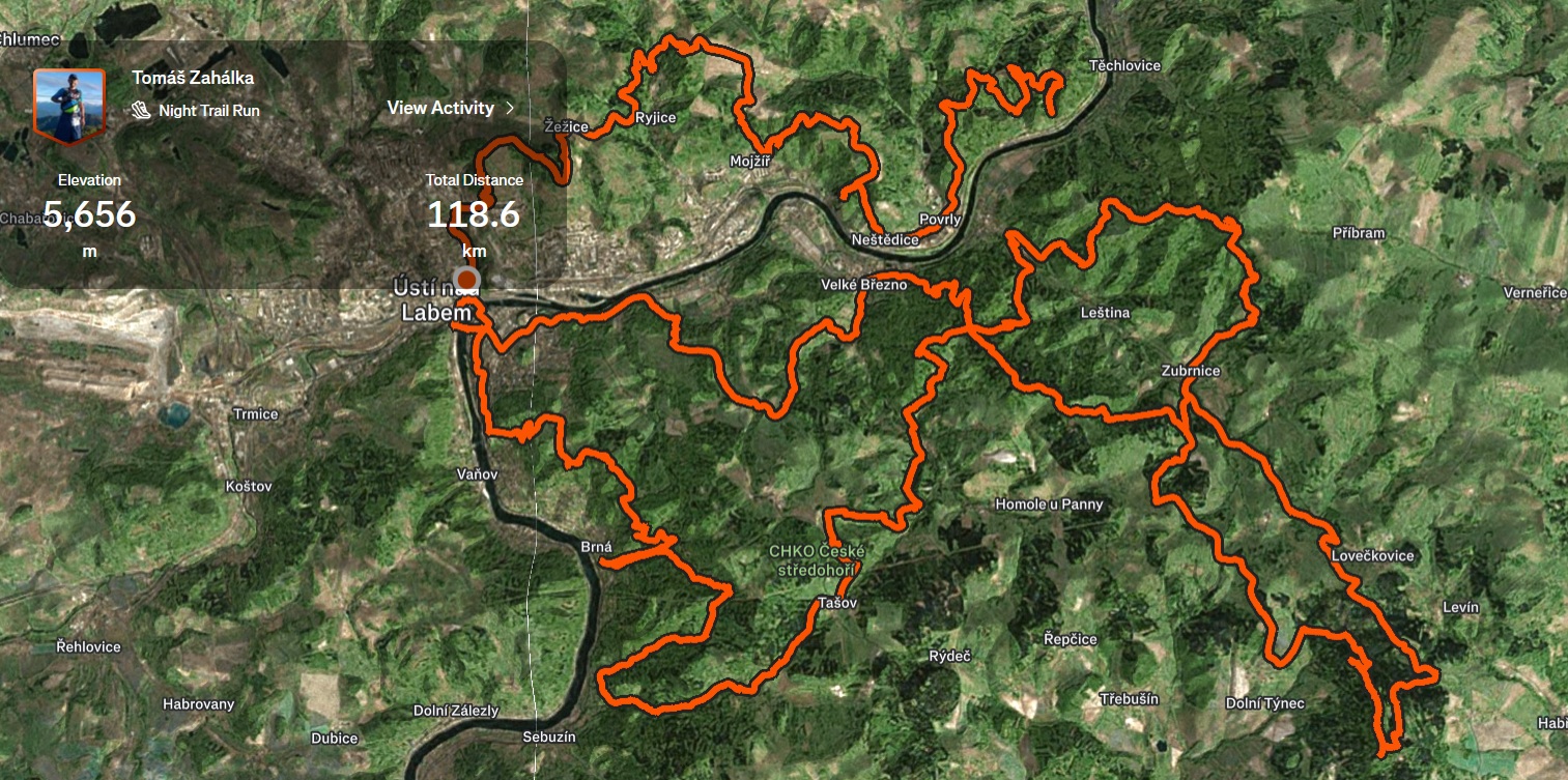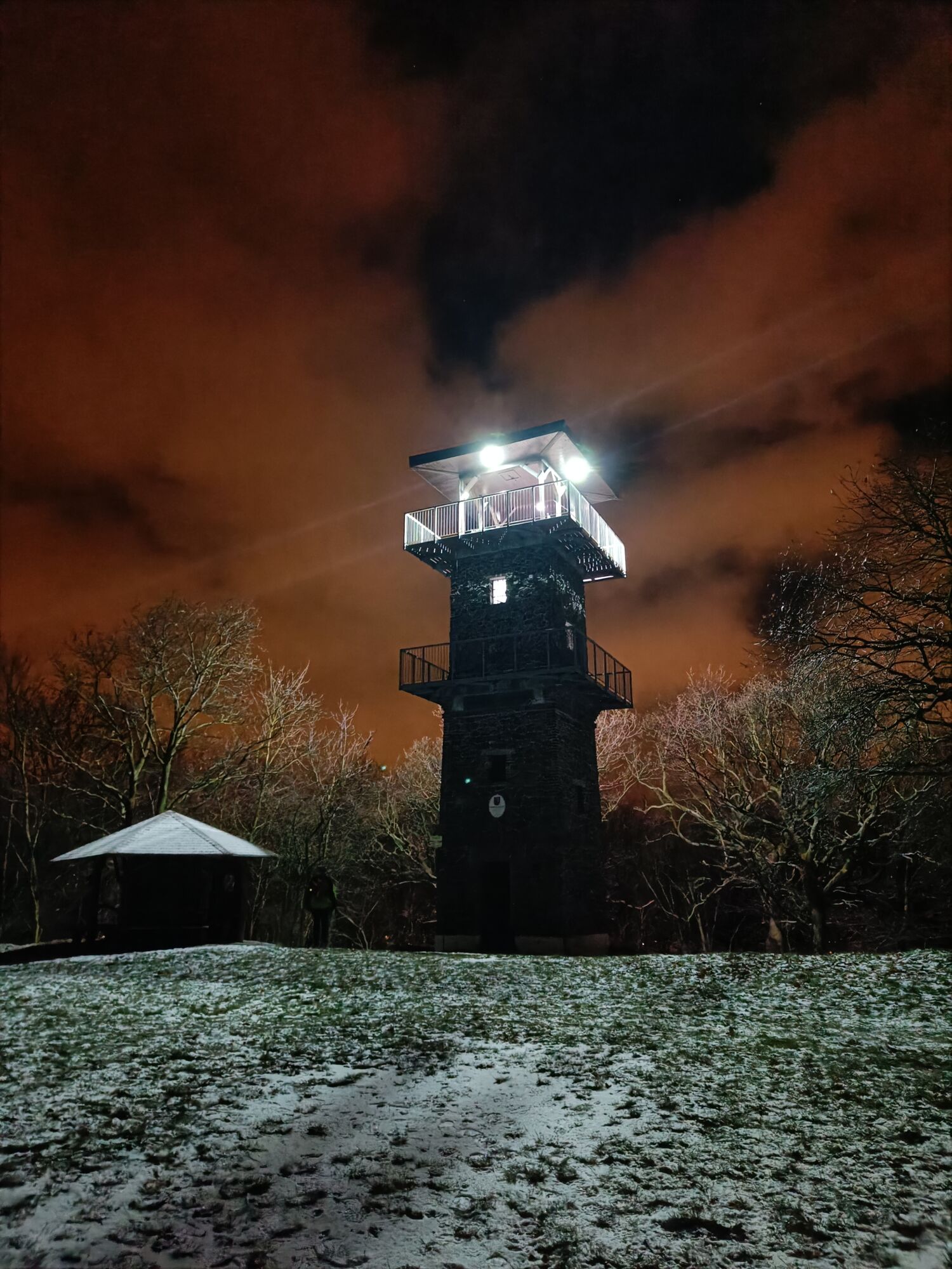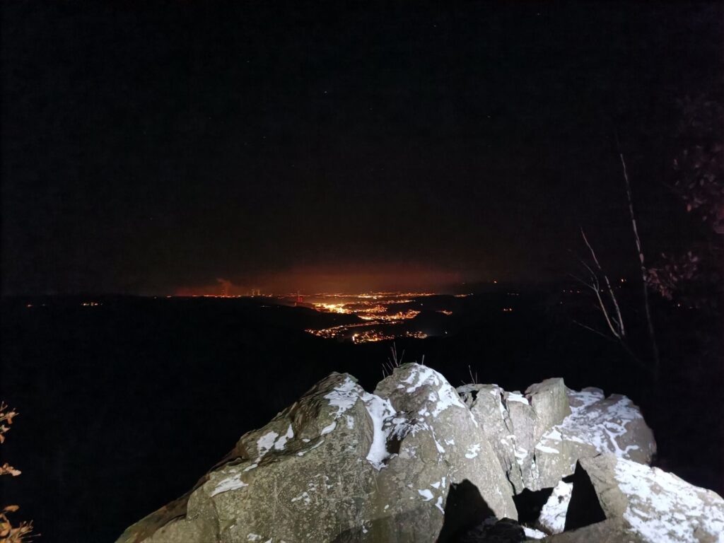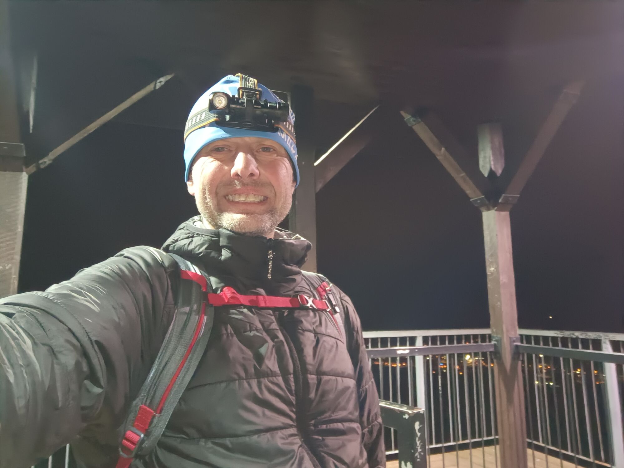 Olaf to odstartoval ve 23:20. A rovnou funíme do kopce, oblečení jsem trochu přehnal. Sklon jako prase, přelézání stromů, výživný kilák prostě. Dál se chodí nahoru, dolů, nahoru. Vracečka Kozí vrch, kde to dolů i lehce klouzalo. Na rozhledně Erbenova vyhlídka překvapivě není kontrola, ale stejně si vystoupám nahoru.