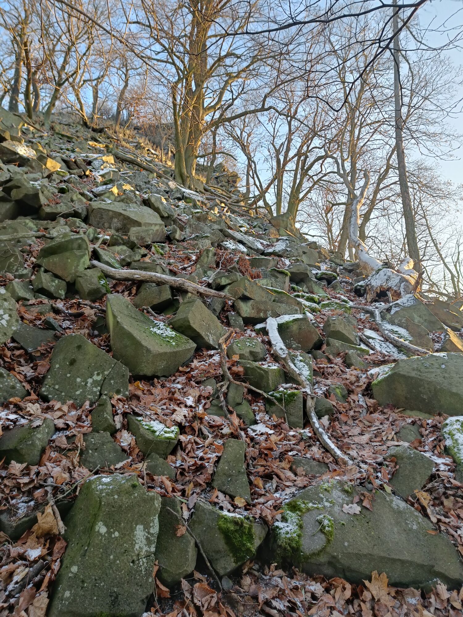 Pohoda, ale najednou trasa odbočuje doleva úplně kolmo nahoru. Míra velkou kládu překročí. My menší podlezeme. Šutry zkouší pozornost všemi možnými tvary a velikostmi. Výhled Panny Marie stojí za to. Dostat se dolů taky. Terény mám rád, ale tahle šutrová hrůza mi jde pomalu.