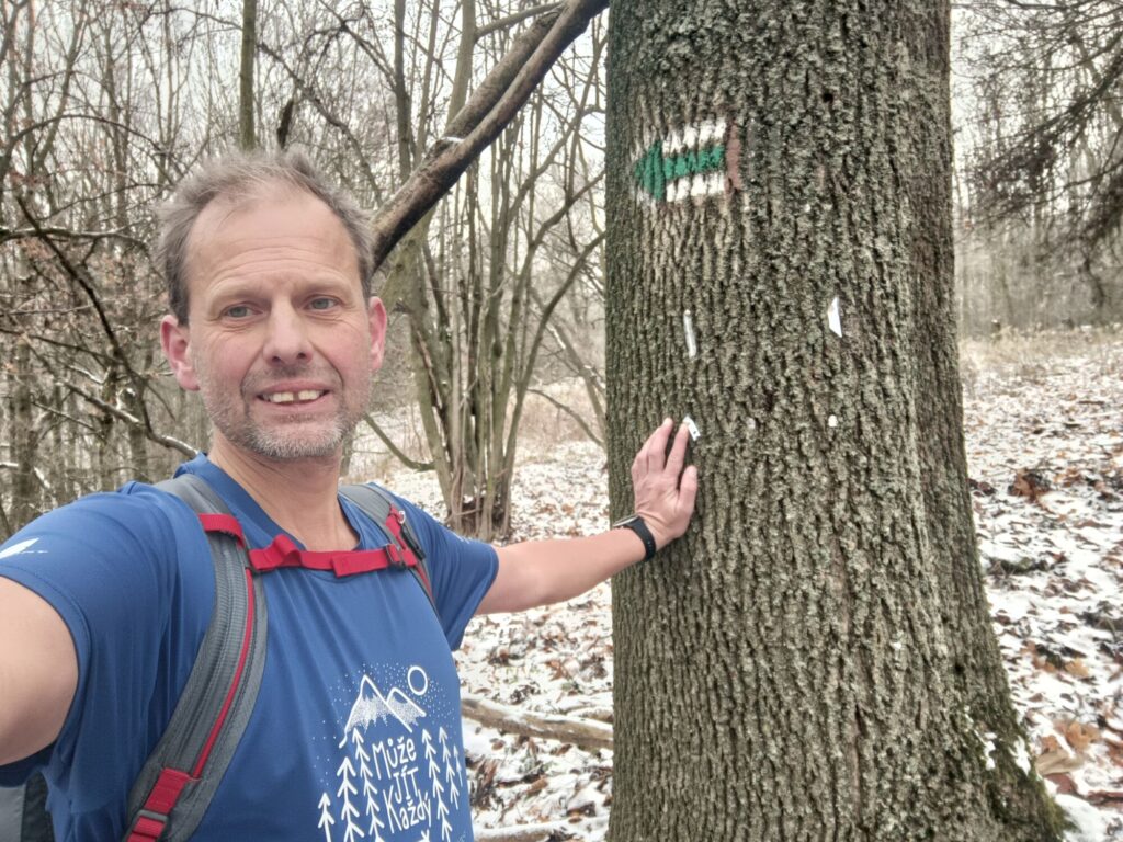 Koukám do mobilu na další kontrolu. Velká kláda, přeskočím ji i s mobilem v ruce. V Brné u točny kontrola a zase zpátky nahoru. V kopci a pak dál jdu zhruba půl hodiny jen v tričku.