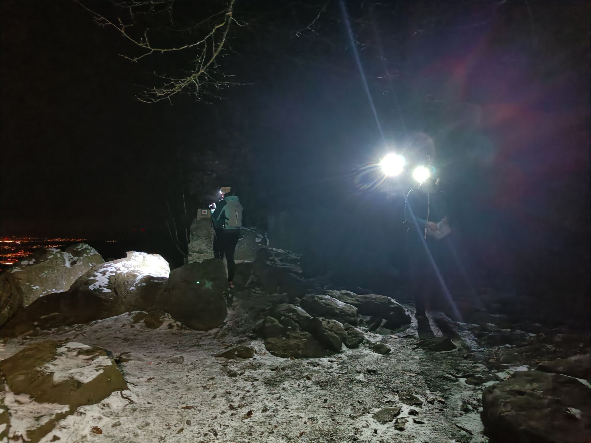 Lucka rázně zavelí, za deset minut jdeme. Já to beru lážo plážo a s Markem jdeme pár minut po nich. Jak se dalo čekat, bude se stoupat na rozcestí. Klesání po širší cestě do Velkého Března. Kopec nahoru bych mohl nazvat i podle loňska usínák. Zavřu oči a čelovky přede mnou se skokem vzdálí 😀 Pak teda prozradili, že i běželi.