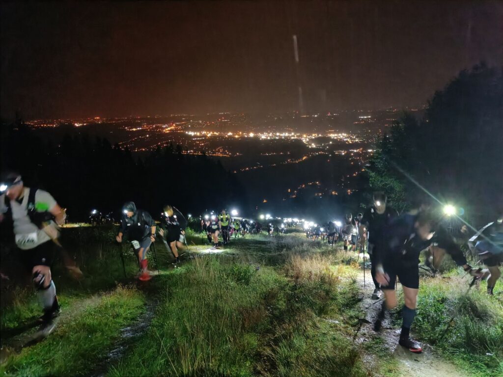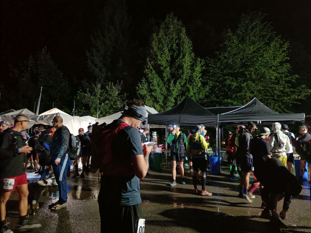 Následuje první kopec, zrovna předbíhám Lucii. Do prudkého kopce mi v dešti přijde pláštěnka zbytečná, to uschne. Ale lehčí vystoupení z komfortní zóny to je. Stoupám poměrně slušnou rychlostí. Malý Javorový, Javorový a seběh k první občerstvovačce. Voda a ionťák jsou ve velkých nádržích a je tam dostatek kohoutků si načepovat. Ionťák mi nesedl, pak ho vynechávám. Sjezdovka Řeka, bez klacků jsem se jednou málem převrátil dolů, jinak dobrý. Dav se pohybuje akorát rychlostí. Seběh jde, tradičně mě ale předbíhá Alena s Vaškem. A další občerstvení, slušný výběr jídla i Kofola.