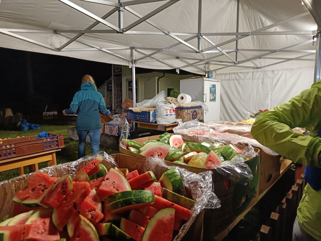 Občas jsem online, sleduju výsledky, Aleš a Lucie jsou zatím za mnou. Když umím na Lysou i bosky, botmo můžu dopadnout na jakýkoliv šutr a že jich dolů rozházených je. Pak to s jednou běžkyní doběhnu až do Ostravice na občerstvení. Sám bych to víc prokládal chůzí. Tady není úplně půlka. Ale čas 9:26 je solidní a potkávám Evu. Tradičně násobím dvěma, plus nějaký ten metr a únava… teoreticky by to mohlo být pod 22h. V roce 2019 za 21:58 s hůlkami