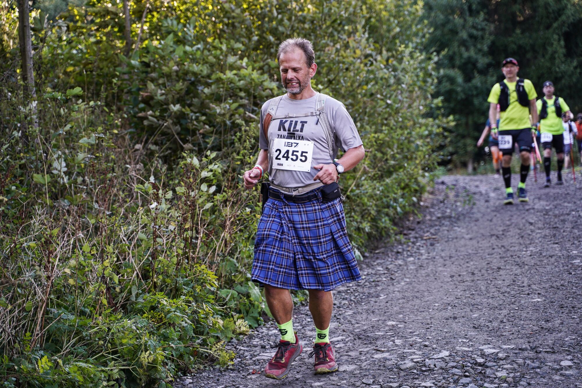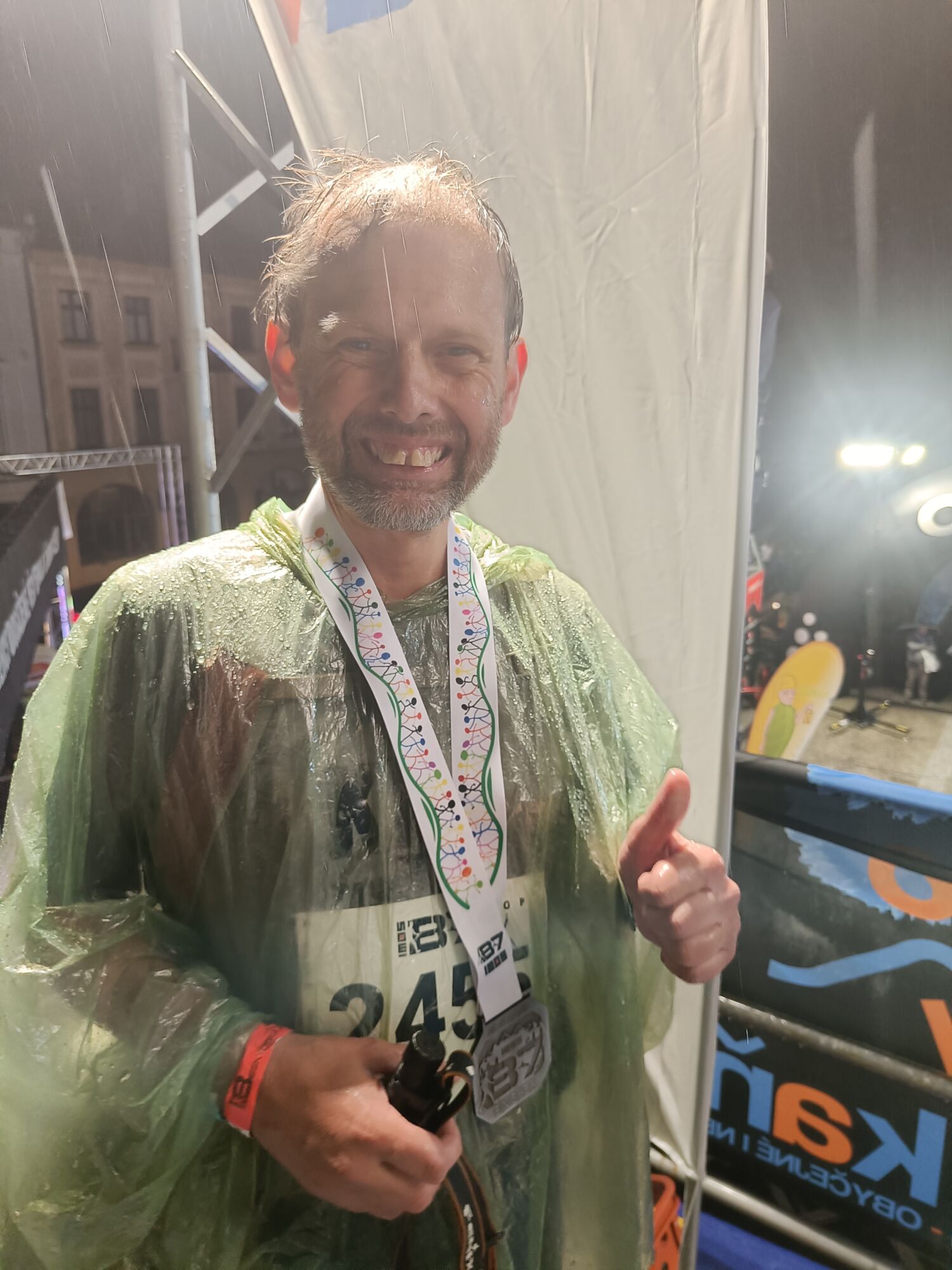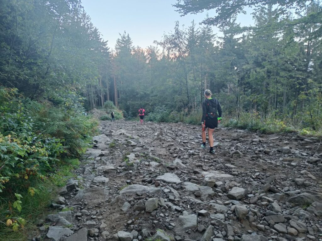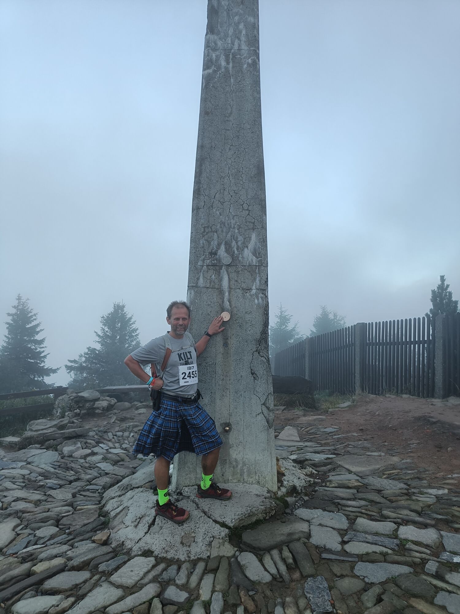 Čím výš tím víc prší, chudák mobil pak nereaguje na dotyk. U rozhledny beru pláštěnku. Jednorázovou, už po druhé slepenou izolepou. Zbývá zhruba 5,5 kilometru. Jenže kolem projde poměrně dost závodníků. Tak dobře, dolů skáču po kamenité cestě s proudy vody jak kamzík. Předběhnu jich ladně asi třicet. Déšť, místy mlha nevadí, vidím stále každý kamínek. Ti po nás to tady museli mít ještě horší.