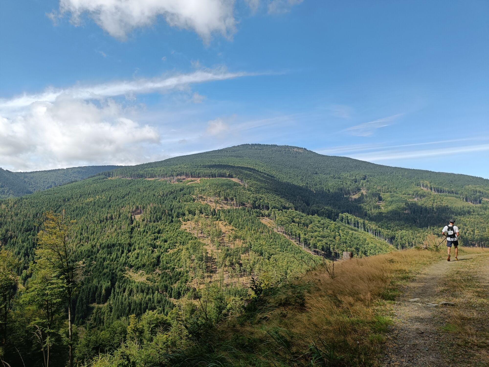 A hurá na seběh, v kilometrovém šutrovém úseku skáču dolů. Dole se těším na Marlenku a kafe, jeden kousek jsem prostě vdechnul. Následuje poměrně dlouhý výstup zpátky na hřeben. Nahoře potkáte ty, co jdou zkratkou. Ještě jedna pauza u hotelu Radegast, dávám ještě malý Radegast 🍺