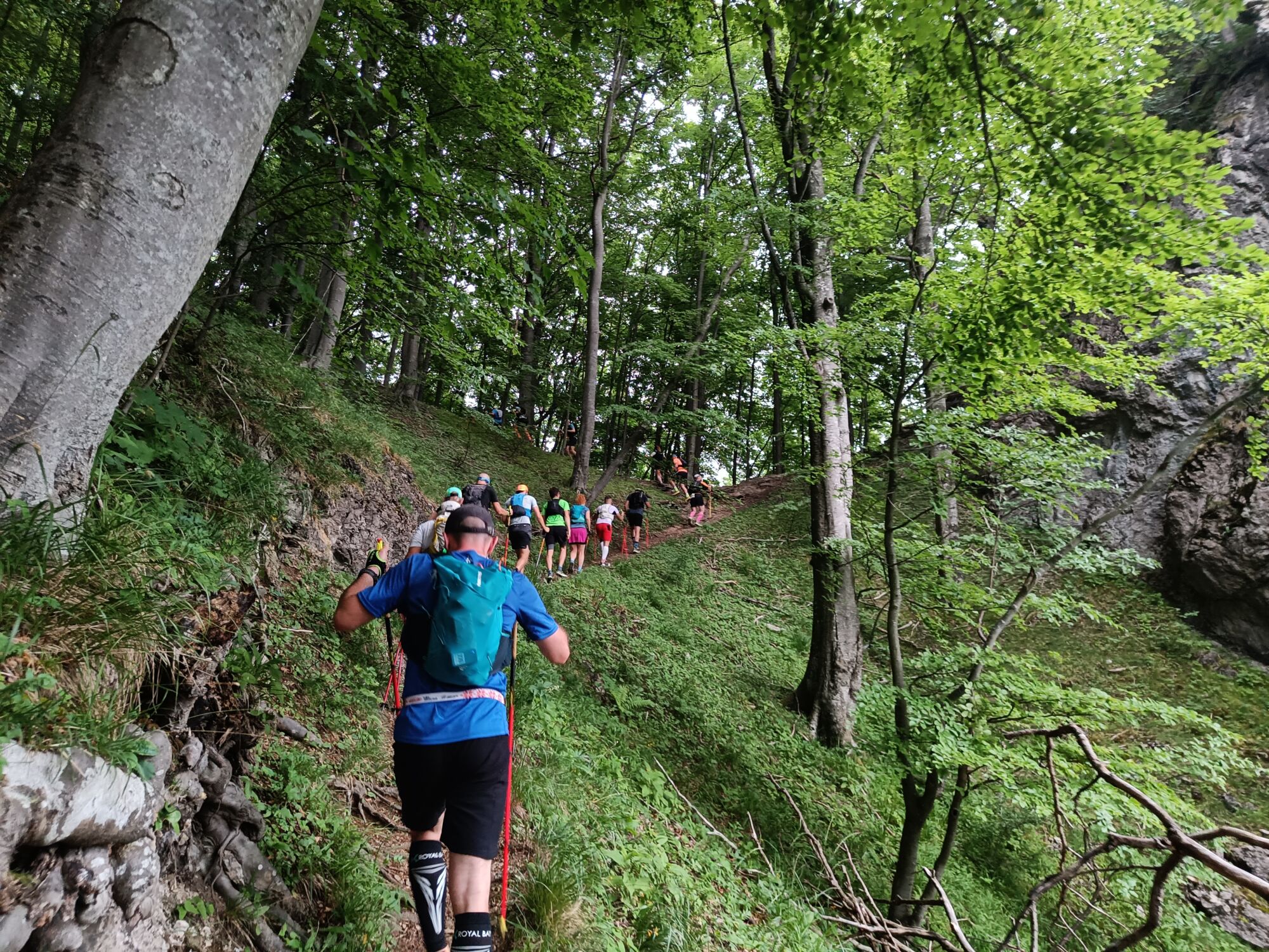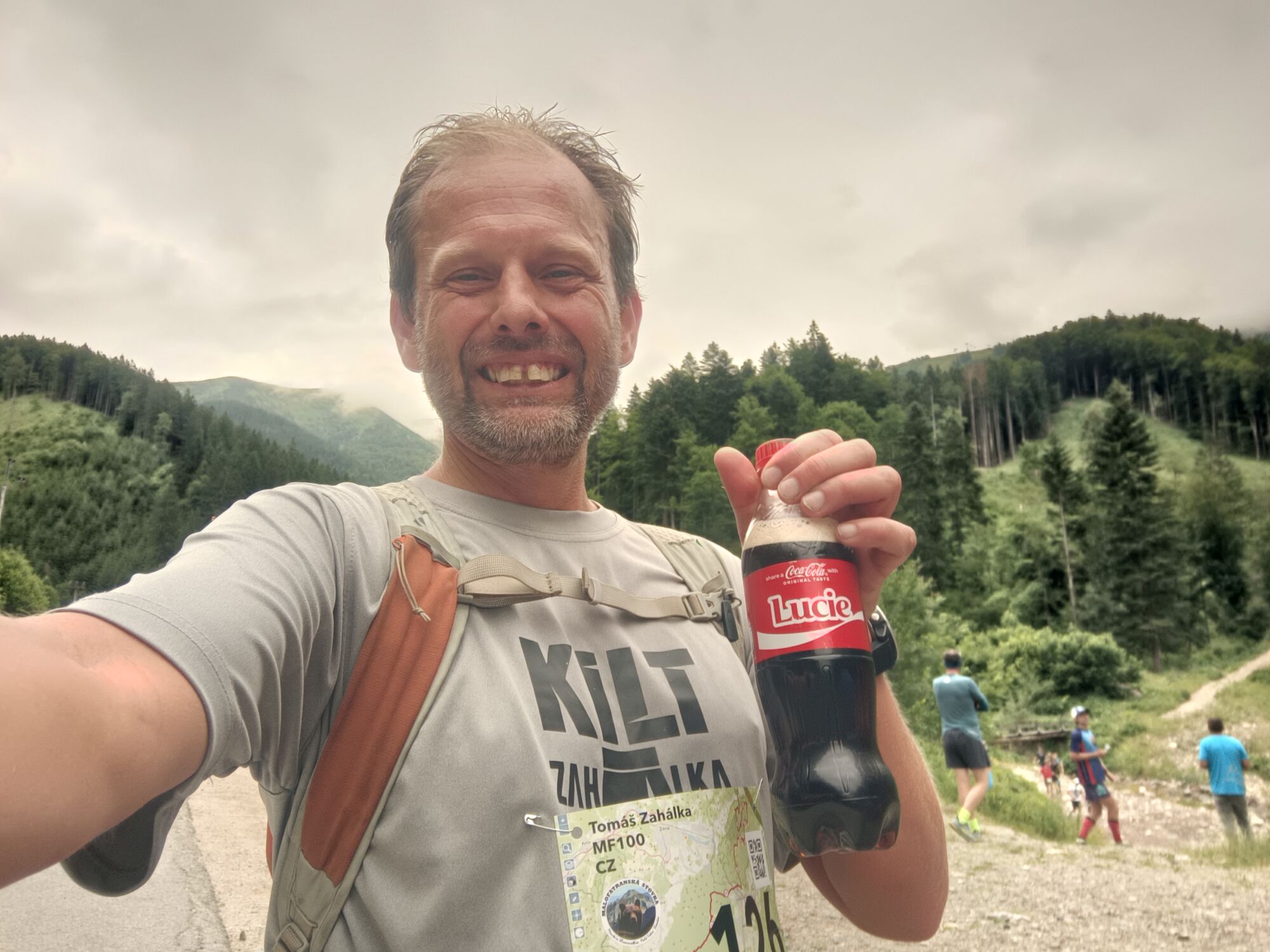 Přespání v tělocvičně není ideál, někdo chrápe víc než já. Ráno dám kafe, vezmu spíš těžší batoh a jdu na start, který je v 6:00. Na začátku se běží tři kilometry po asfaltce, tempo kolem 6:30 je myslím akorát. Pak nastává ukrutné stoupání. Bojím se limitů, tak nahoře občas i předbíhám. Funím do kopce, které nemají konce. Vždyť po deseti kilometrech je tam přes jedenáct set výškových. Sešup dolů na občerstvovačku Stará dolina si užívám. Hecuju ostatní, že limit asi nedáme na půl kilometru zbývá padesát minut. Dole jsem už v 8:46, limit končí v 9:30. Výsledek zatím parádní, ale za cenu vyčerpání velkého množství energie. Prostě dobrý nápad, připálit začátek na kilu, uvidíte dál. Mám ale sebou Colu se jménem Lucie. Vloni jsem tady byl až kolem 9:20, Lucie šla taky. Ta teď našeptávala, to dáš chci tě vidět s medailí. Ale i teď je čas na DNF.