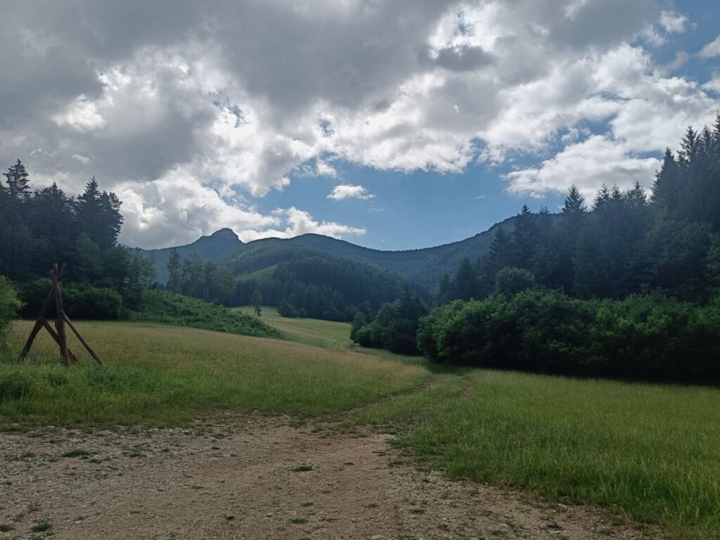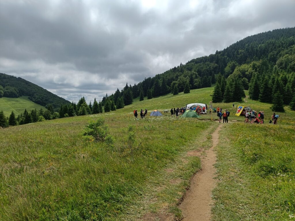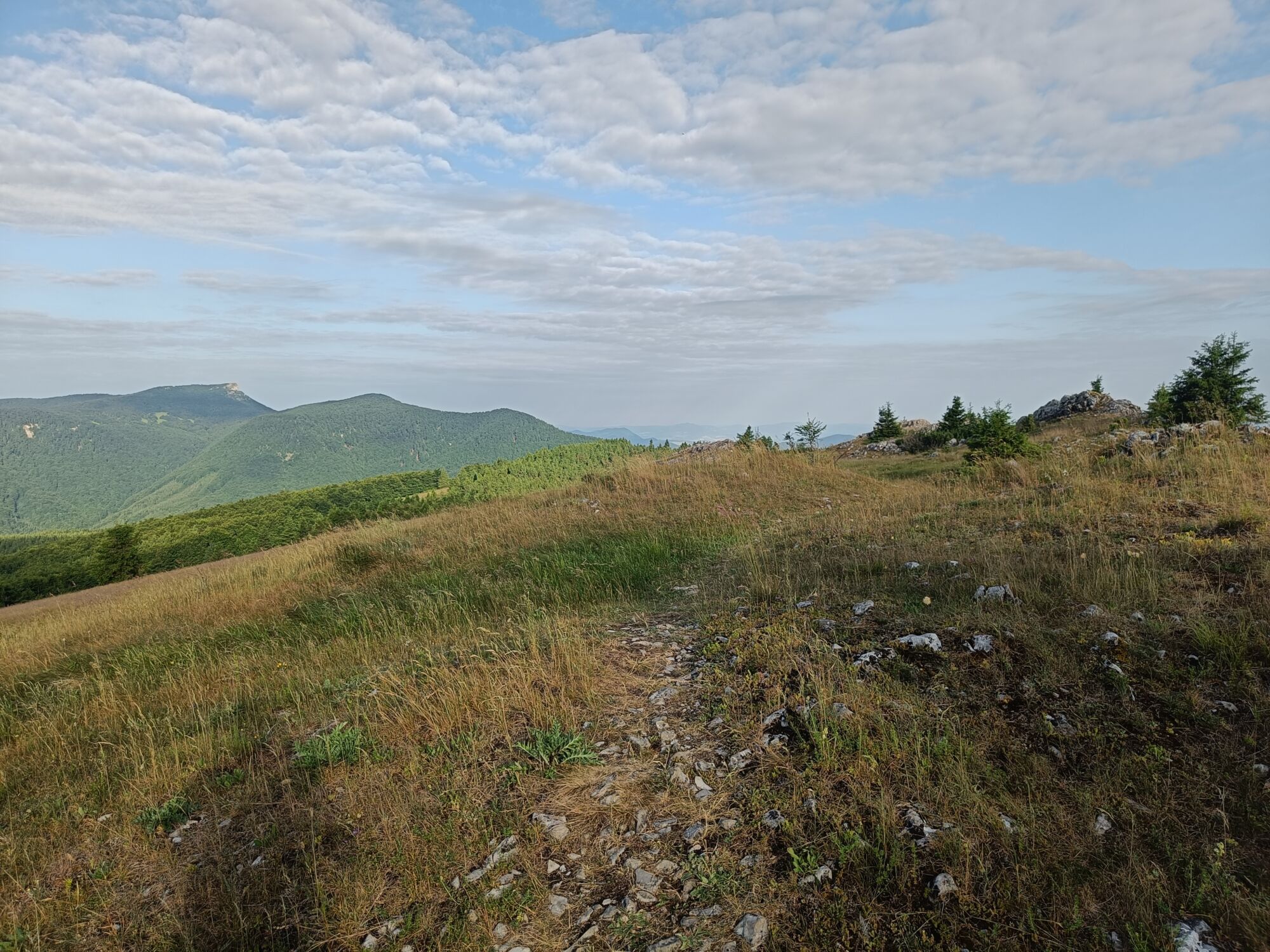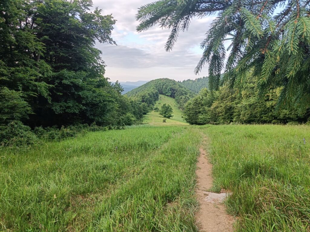Dole mě zachraňuje občerstvovačka s kafem, jsem tu půl hoďky před koncem limitu. Je jasný, že jsem poslední. Už to ale nevzdám 🏃 Pěkně lesem a po louce. V dálce je už vidět ten kopec Klak. Říkám mu ošklivec se skálou nahoře, protože to pak bude dalších nepěkných sedm set výškových.