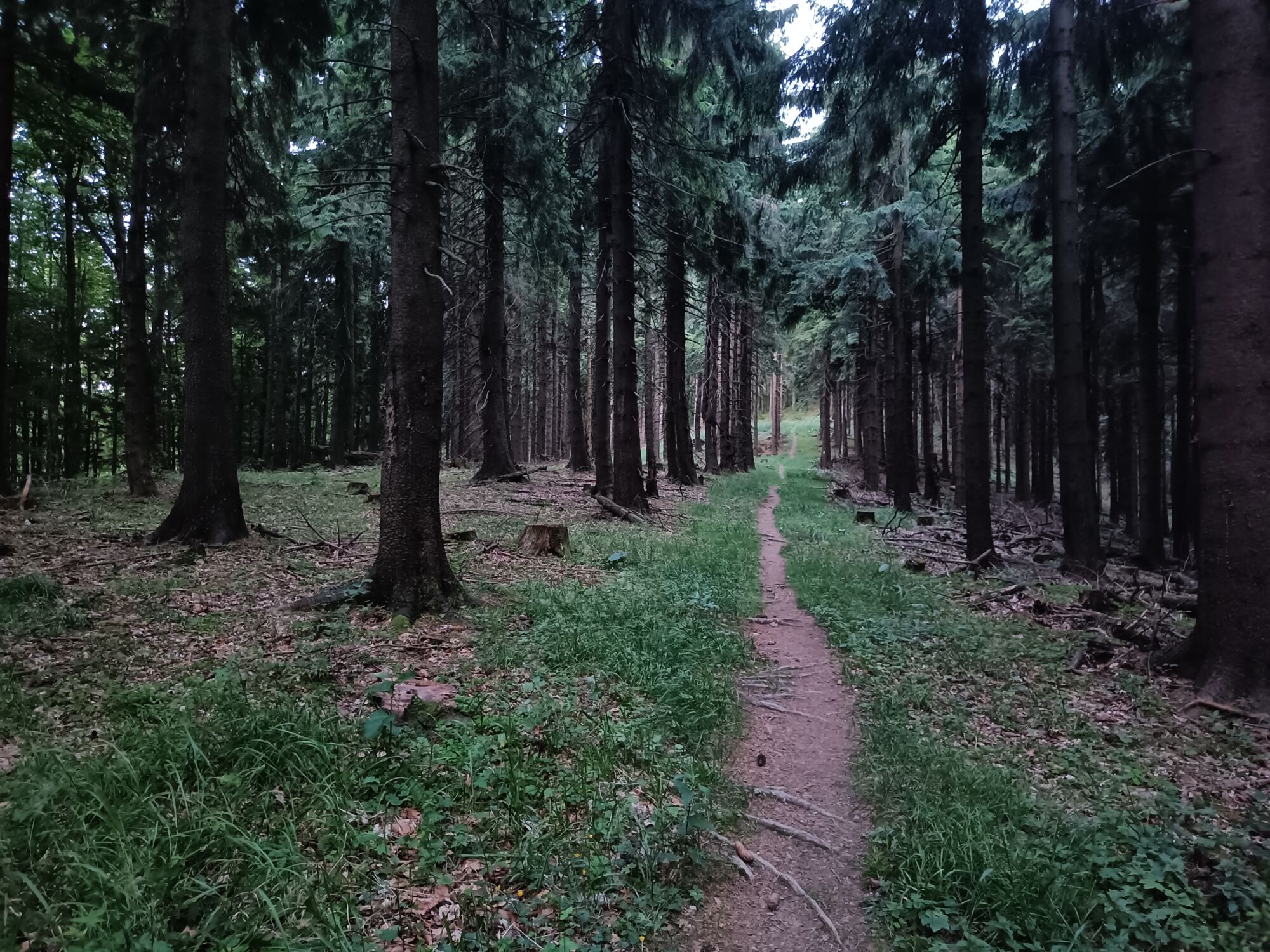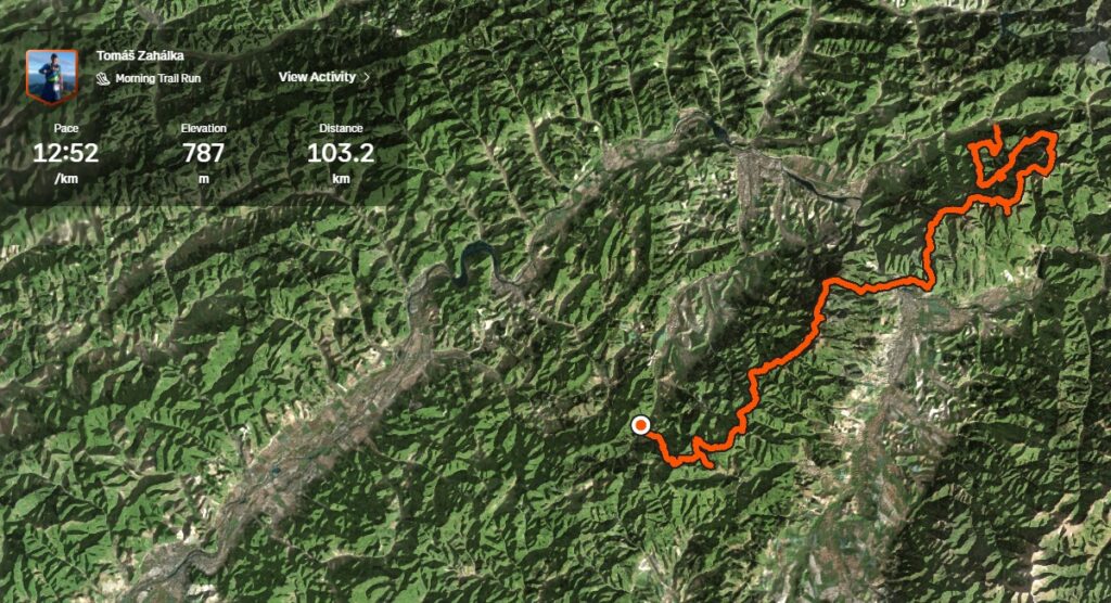 I hodinkám zas došla šťáva, doplňují z powerbanky. Profi výpočtem by to mělo stačit do cíle. Asi třináct kilometrů k další občerstvovačce. Noční terén není nijak hrozný, ale zase to nejde rychle. Hodinky pípájí děsné časy na kilometr. Před rozedněním si lehnu do listí a dávám budíka na pět minut. Bylo by trapný zaspat limit nebo se nechat sežrat medvědem 🐻 Rychlo nabíjení mi funguje, jsem schopný vylézt na Hnilickou Kýčeru. Dolů je to tak prudký, že bych spíš doporučil válet sudy. Jako ještě že není mokro.